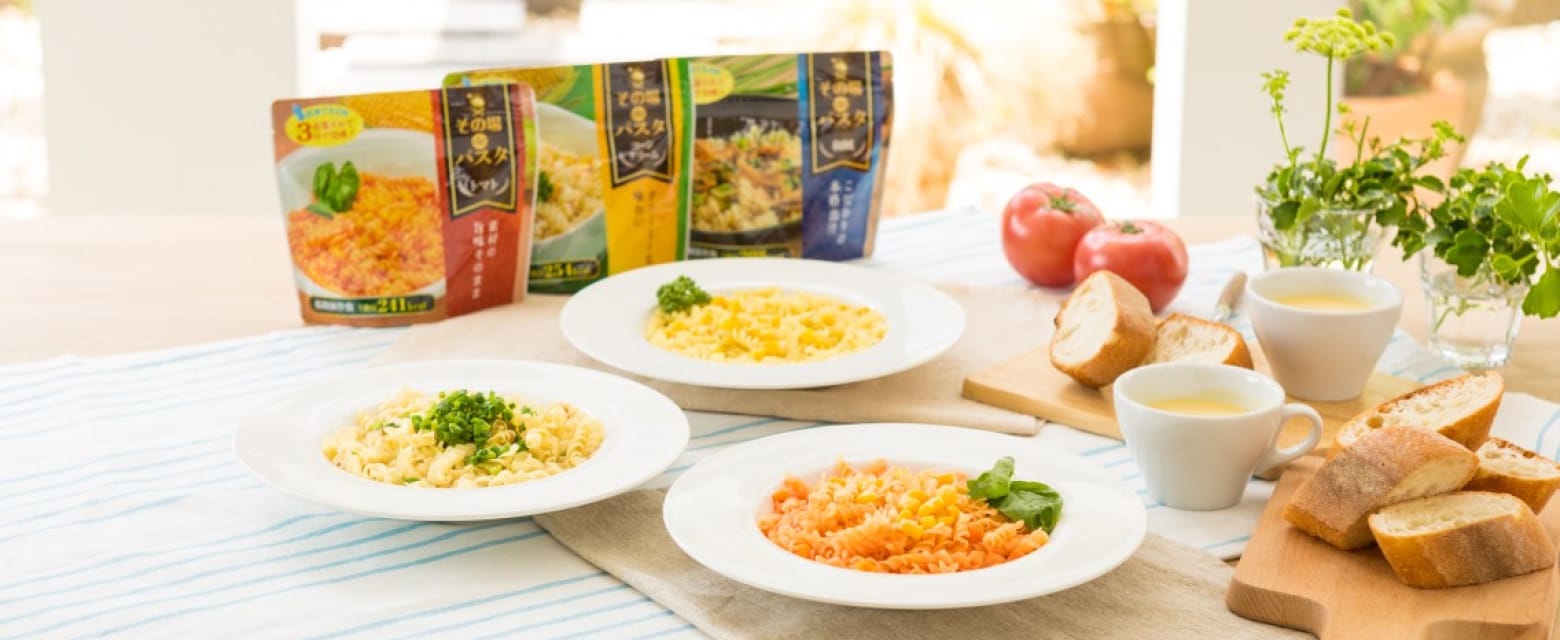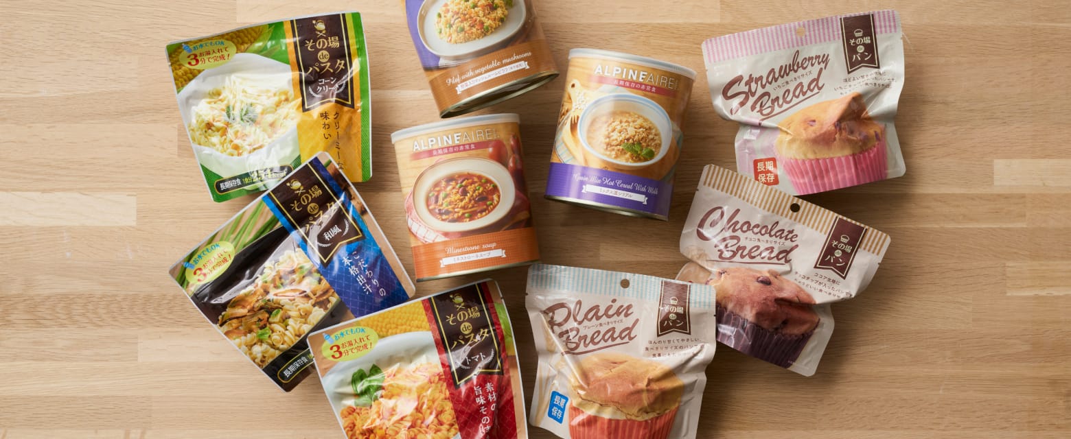 長期保存の非常食「アルパインエア」、5年保存の即席パスタ「その場deパスタ」、アレルギー28品目不使用のフリーズドライスープ「その場deスープ」、食事にもおやつにもなる「その場deパン」